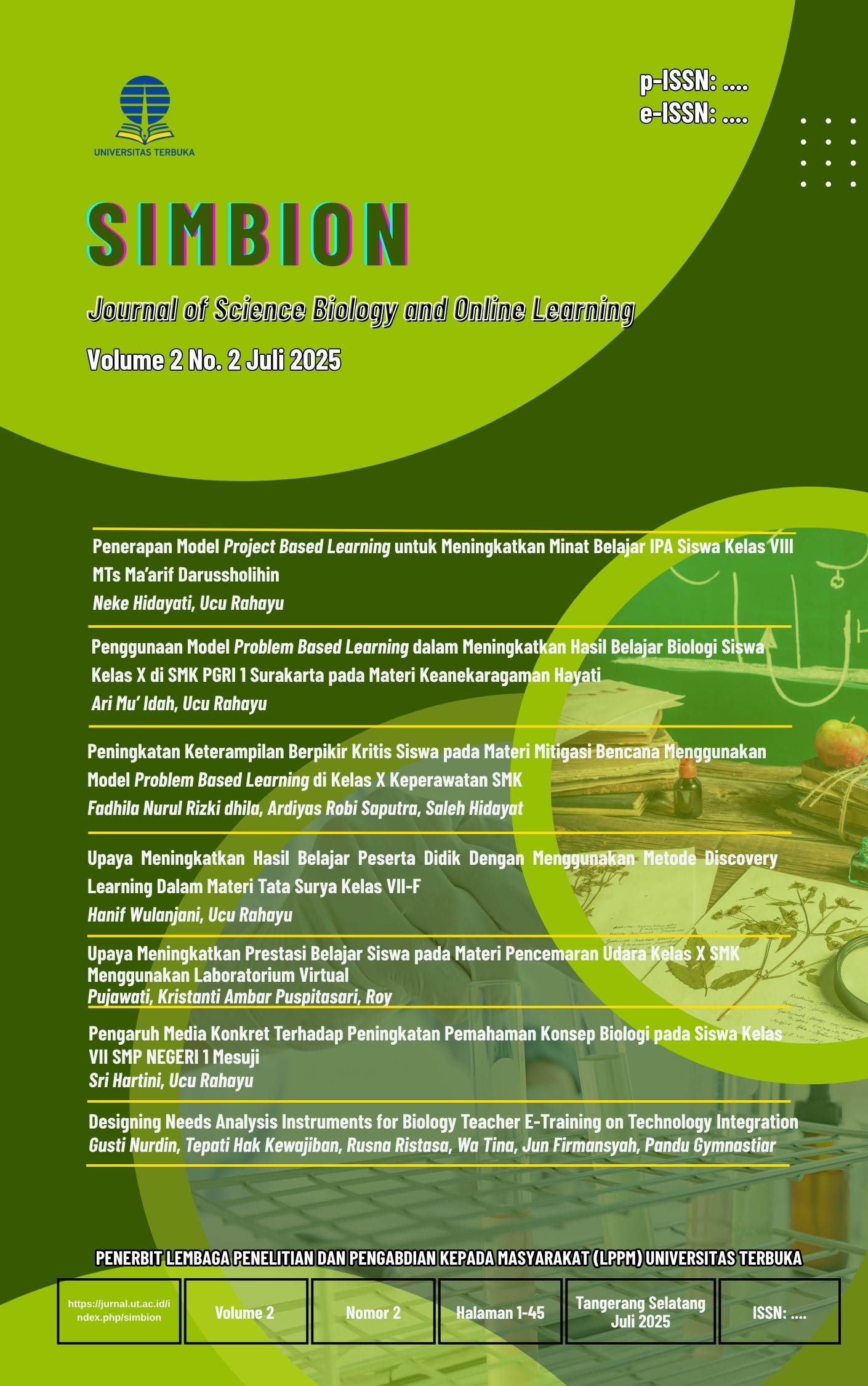 SIMBION: Journal of Science Biology and Online Learning is a journal published under the auspices of LPPM Universitas Terbuka and managed by the lecturers of the Biology Education Study Program. This journal accommodates articles related to learning innovations and biology education, biological studies, and the implementation of biological studies in teaching, as well as online learning in the field of biology. SIMBION: Journal of Science Biology and Online Learning is published twice a year, in January and July.